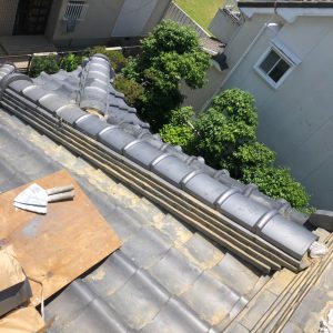 I邸 屋根工事屋根瓦が外れている所に漆喰を使用して固定。
