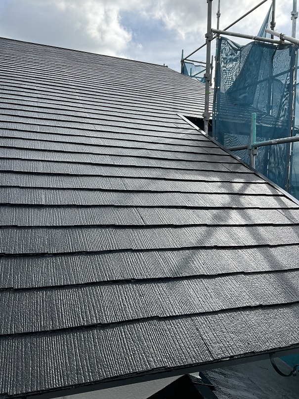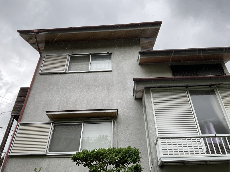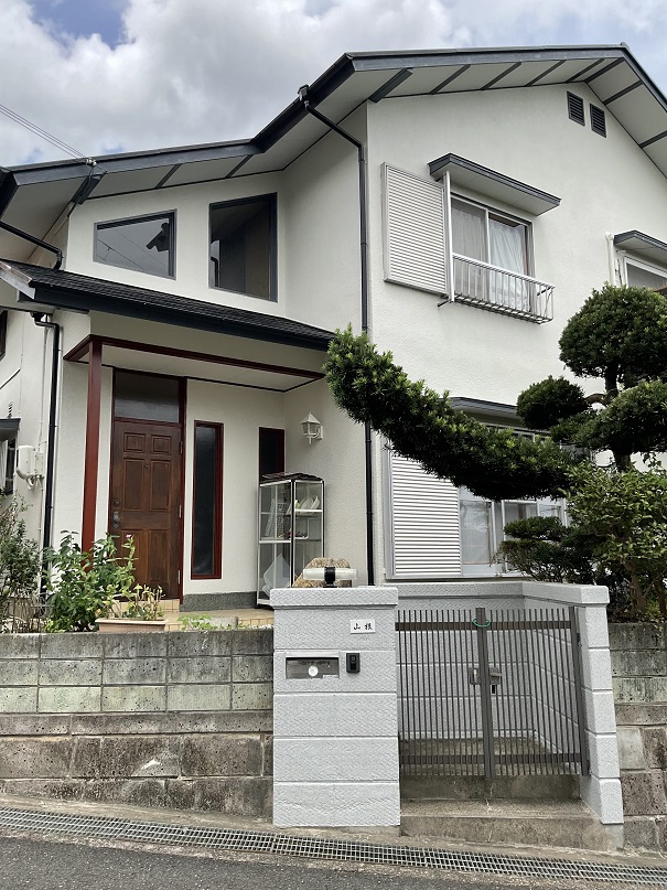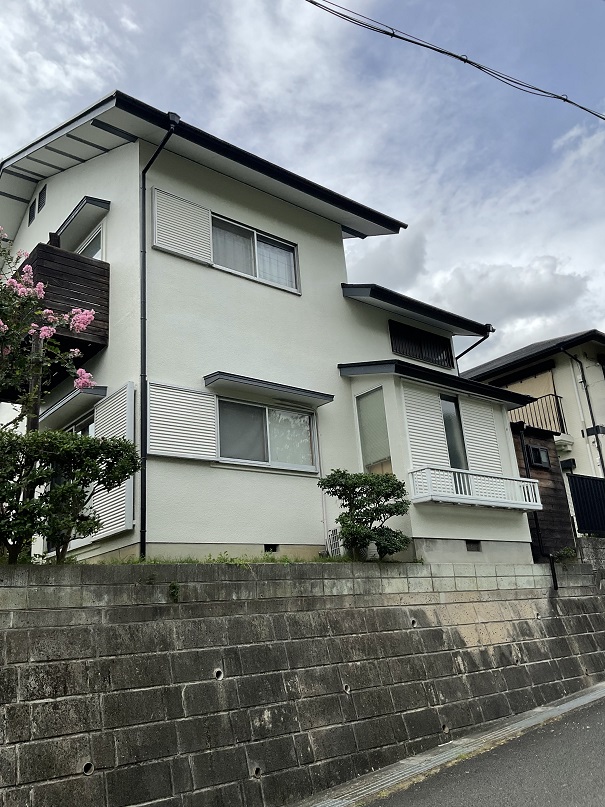 クラックにシーリングをすり込み、下地が浮いている所はモルタル補修、その後、高圧洗浄→下塗り→中塗り→上塗りの3回工程。